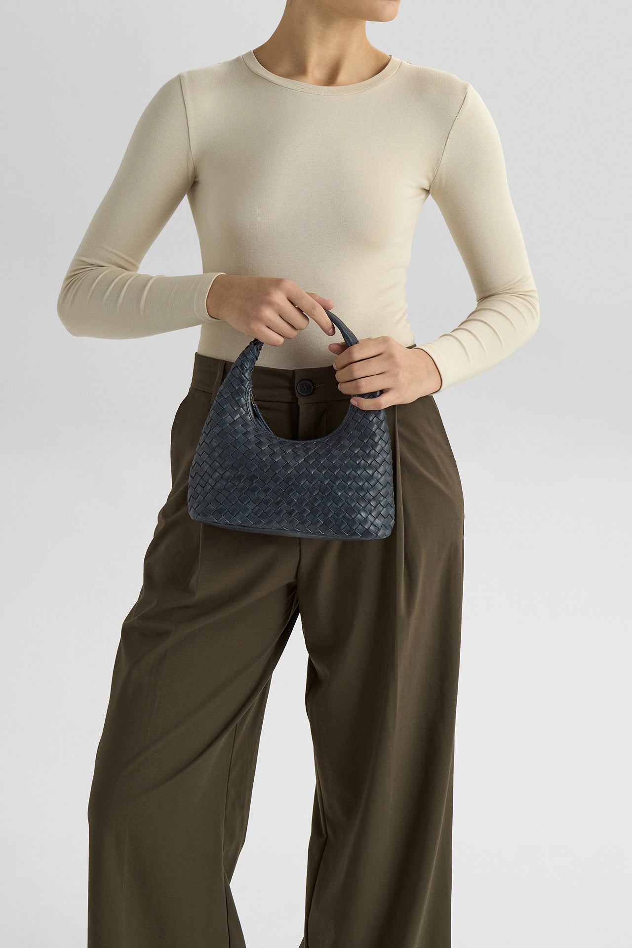 A compact handbag with hand-braided leather and an elegant silhouette.