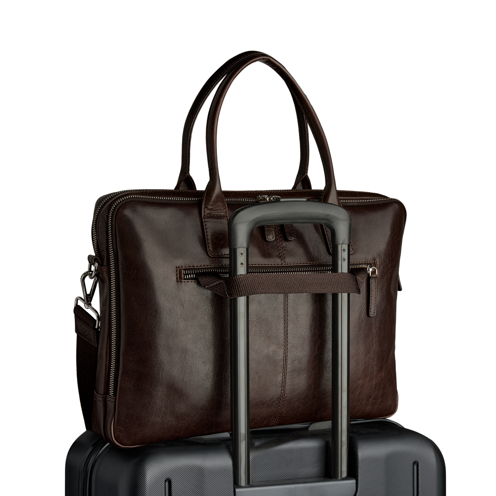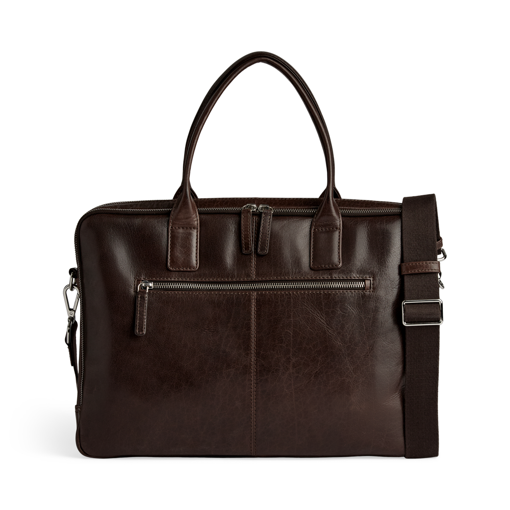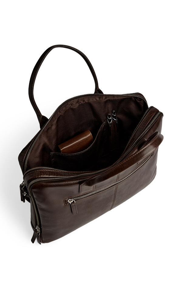 • Made from genuine cow leather • Two large zip compartments • Padded laptop compartment • Interior zip pocket • Interior open pocket • Large open front pocket • Back zip pocket • Back strap for attaching to a suitcase • Adjustable and detachable shoulder strap • Two carry handles • Zip closure • Durable inner lining