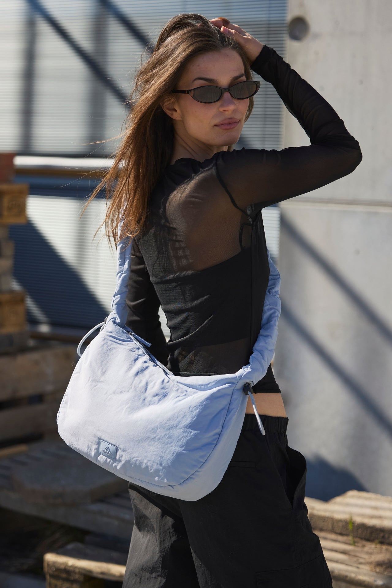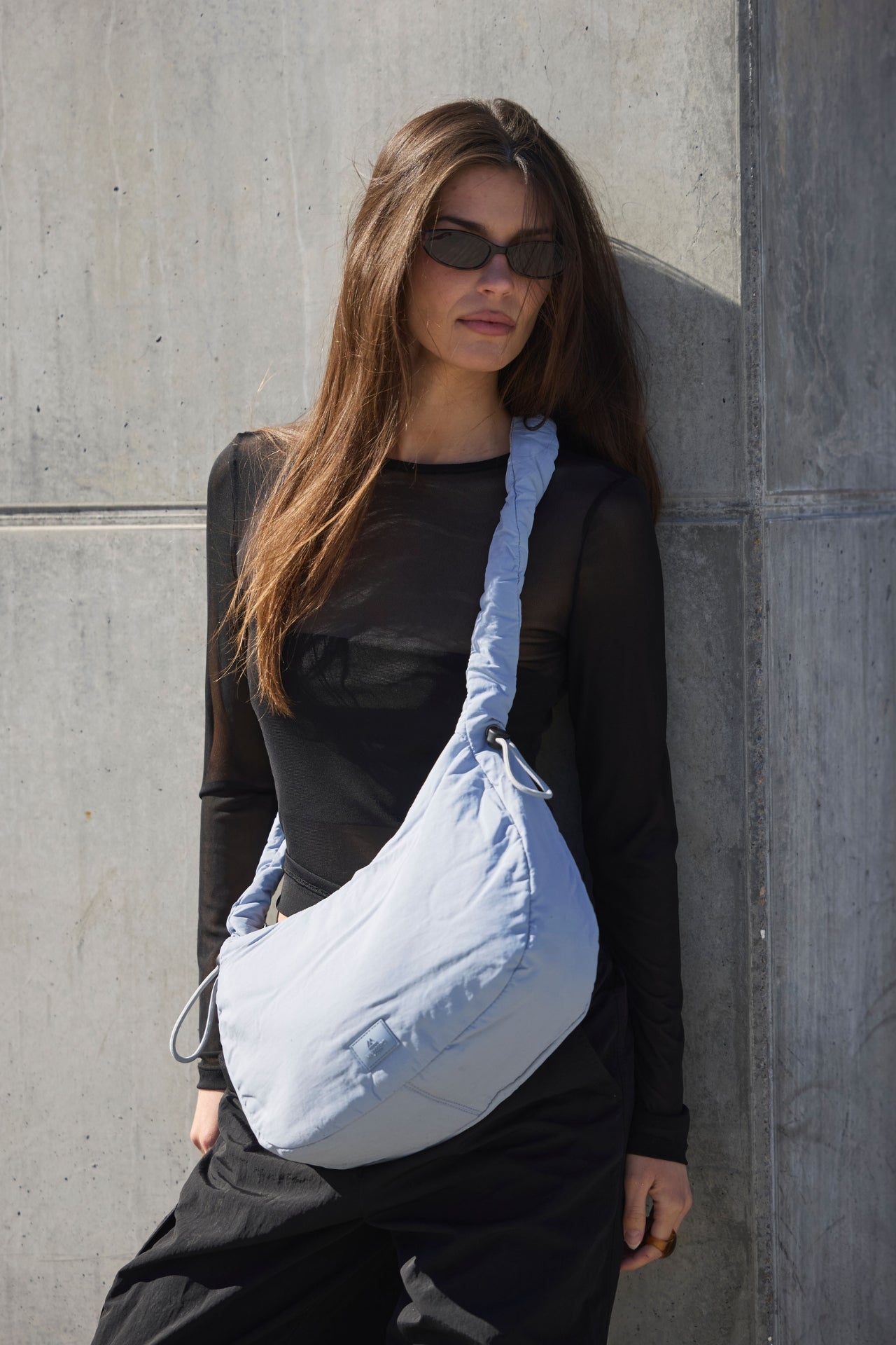 An elegant and playful crossbody with a modern design. Can be worn crossbody or over the shoulder. The softly padded strap with ruched detailing and adjustable drawstring gives the bag a unique and trendy look.