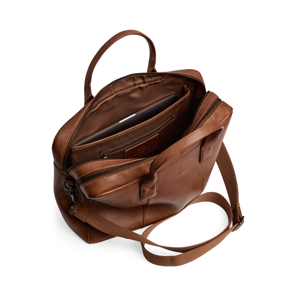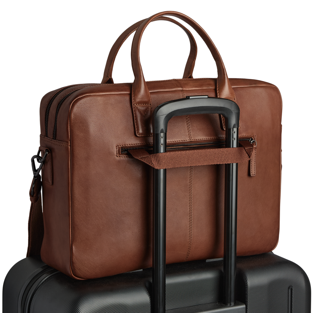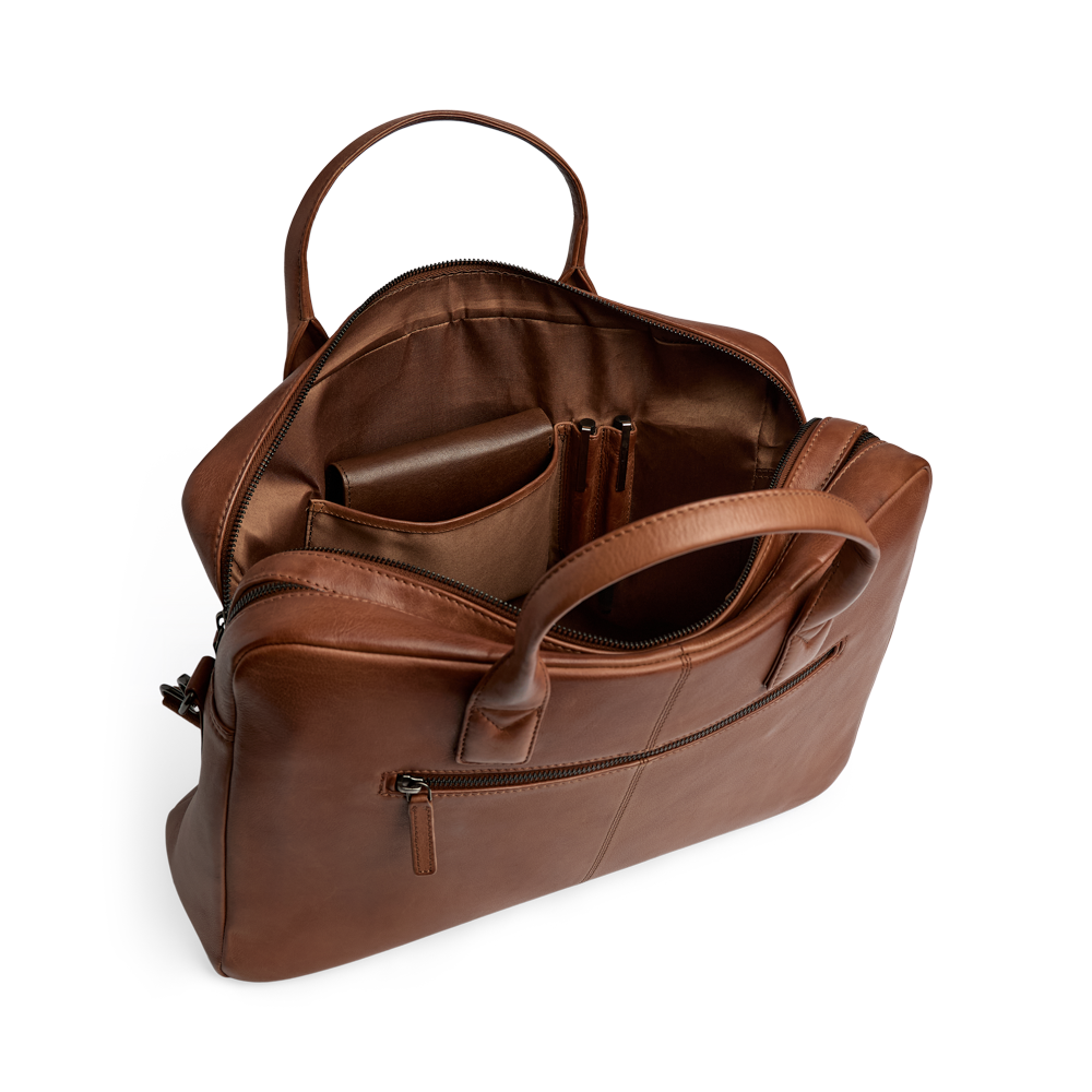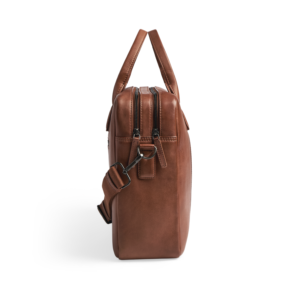 • Made from genuine calf leather • Two separate main compartments with zip closures • Padded compartment for a laptop • Extra compartment for documents or an iPad • Multiple interior pockets for small items and pens • Front zip pocket • Back zip pocket • Back strap for attaching to a suitcase • Detachable and adjustable shoulder strap • Two carry handles • Durable inner lining • Zip closures • The leather’s texture and tone may vary naturally, giving the bag a unique character