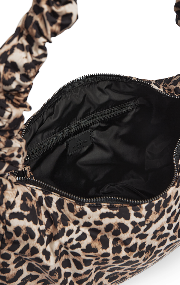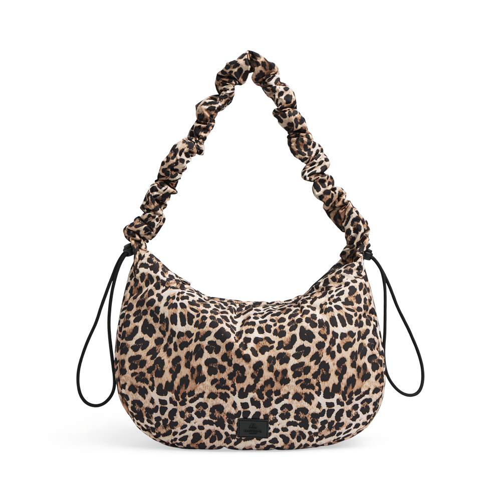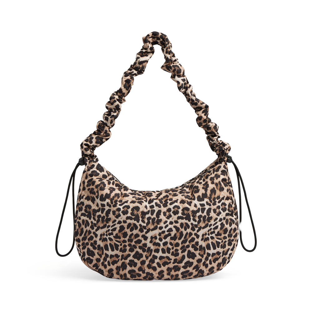 An elegant and playful crossbody. Can be worn crossbody or over the shoulder. The softly padded strap with ruched detailing and adjustable drawstring gives the bag a unique and trendy look.
