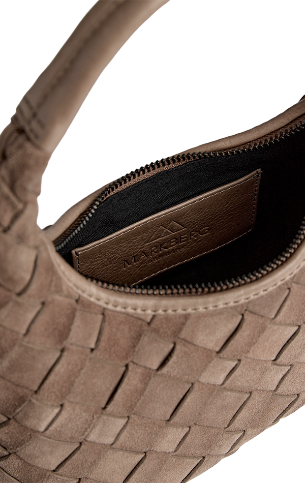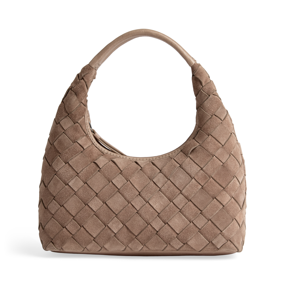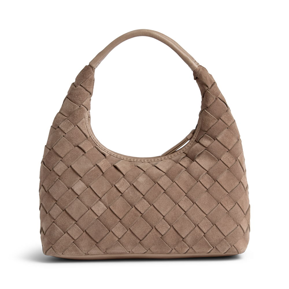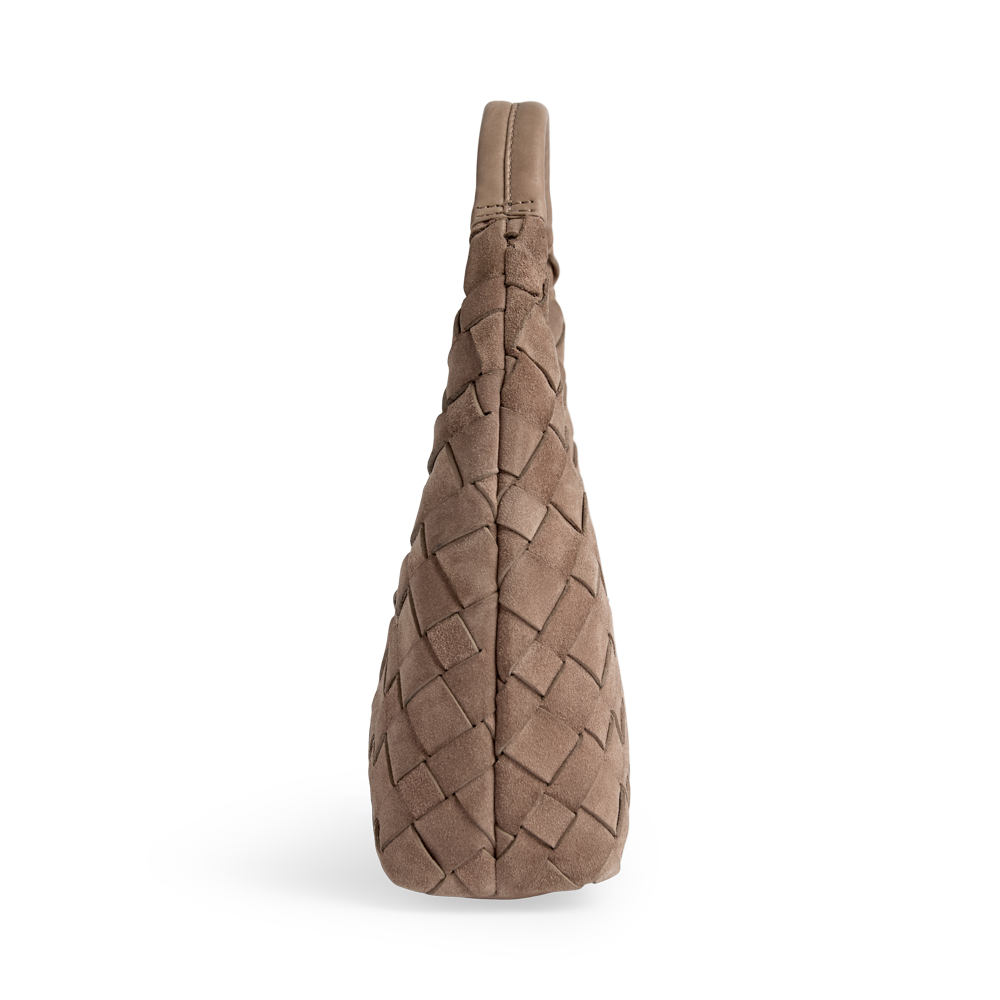A compact handbag with hand-braided suede and an elegant silhouette.
