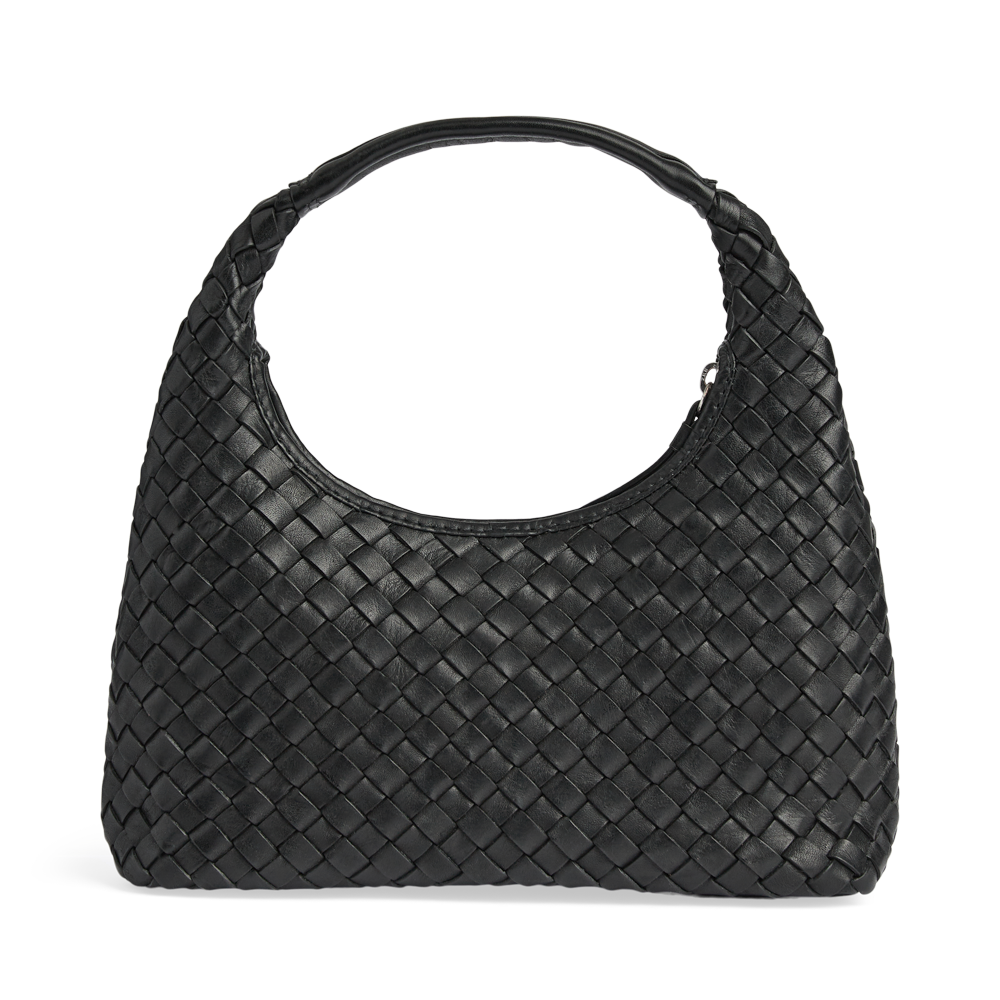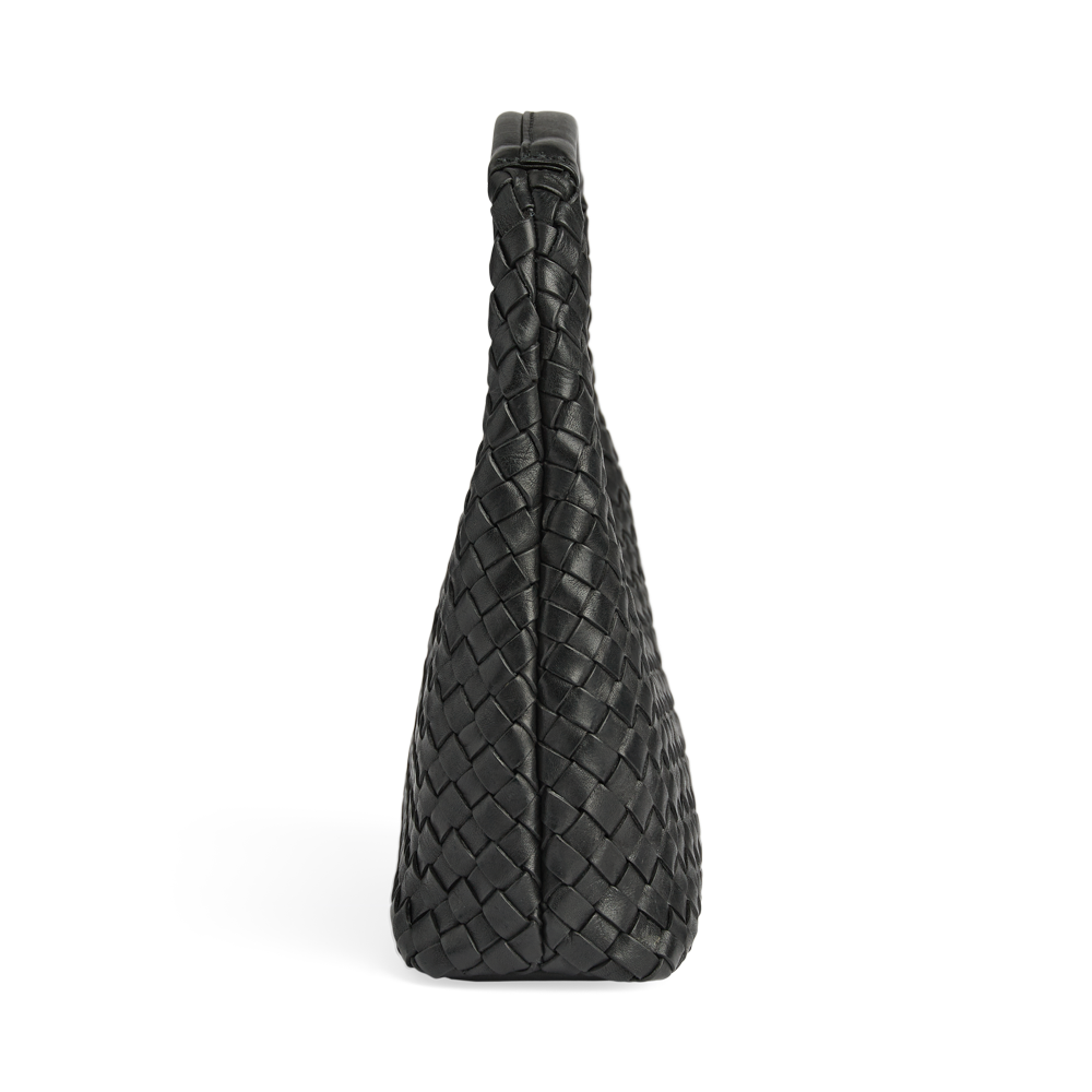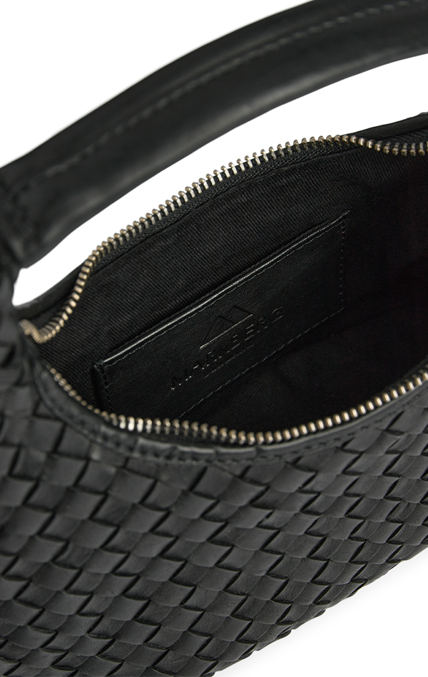 A compact handbag with hand-braided leather and an elegant silhouette.