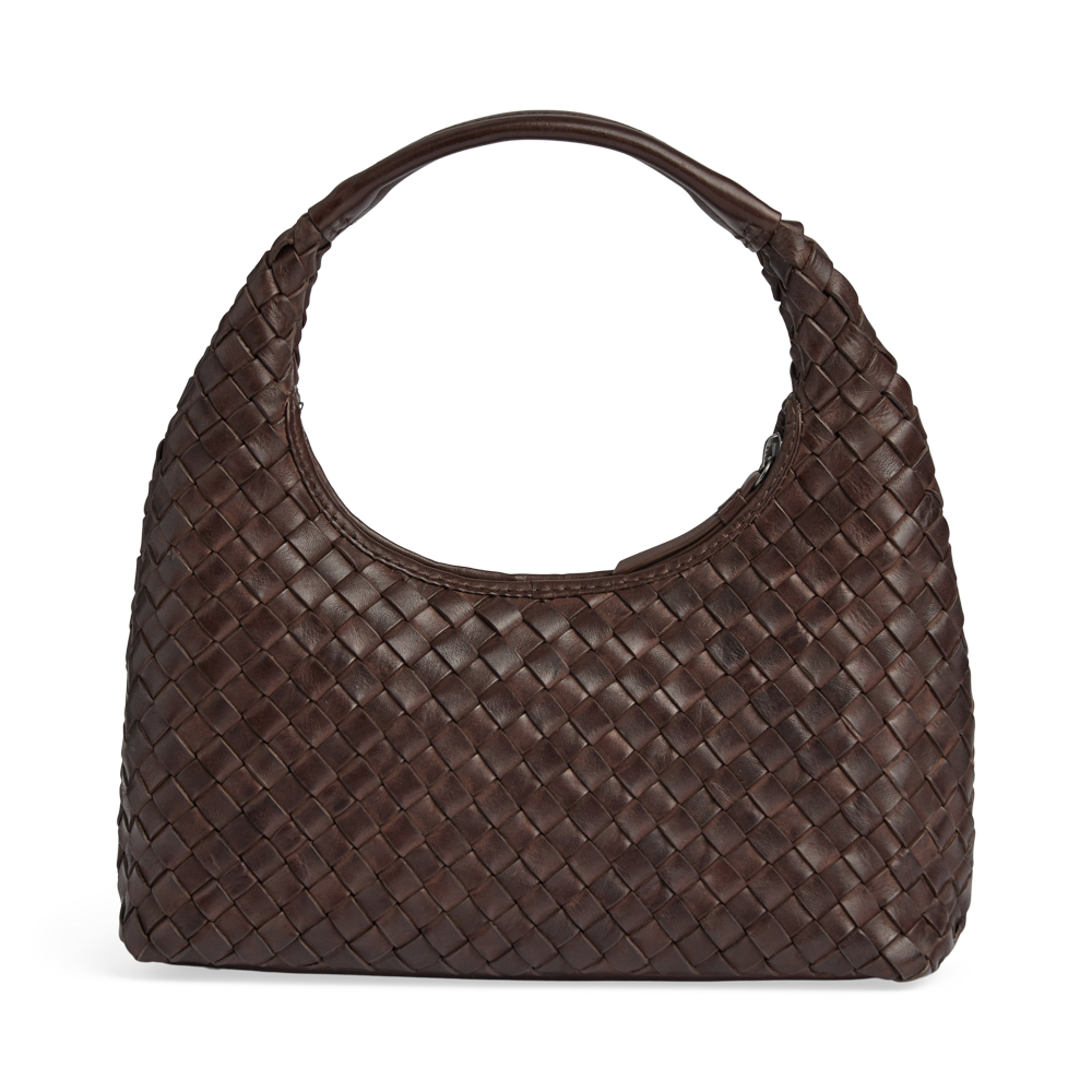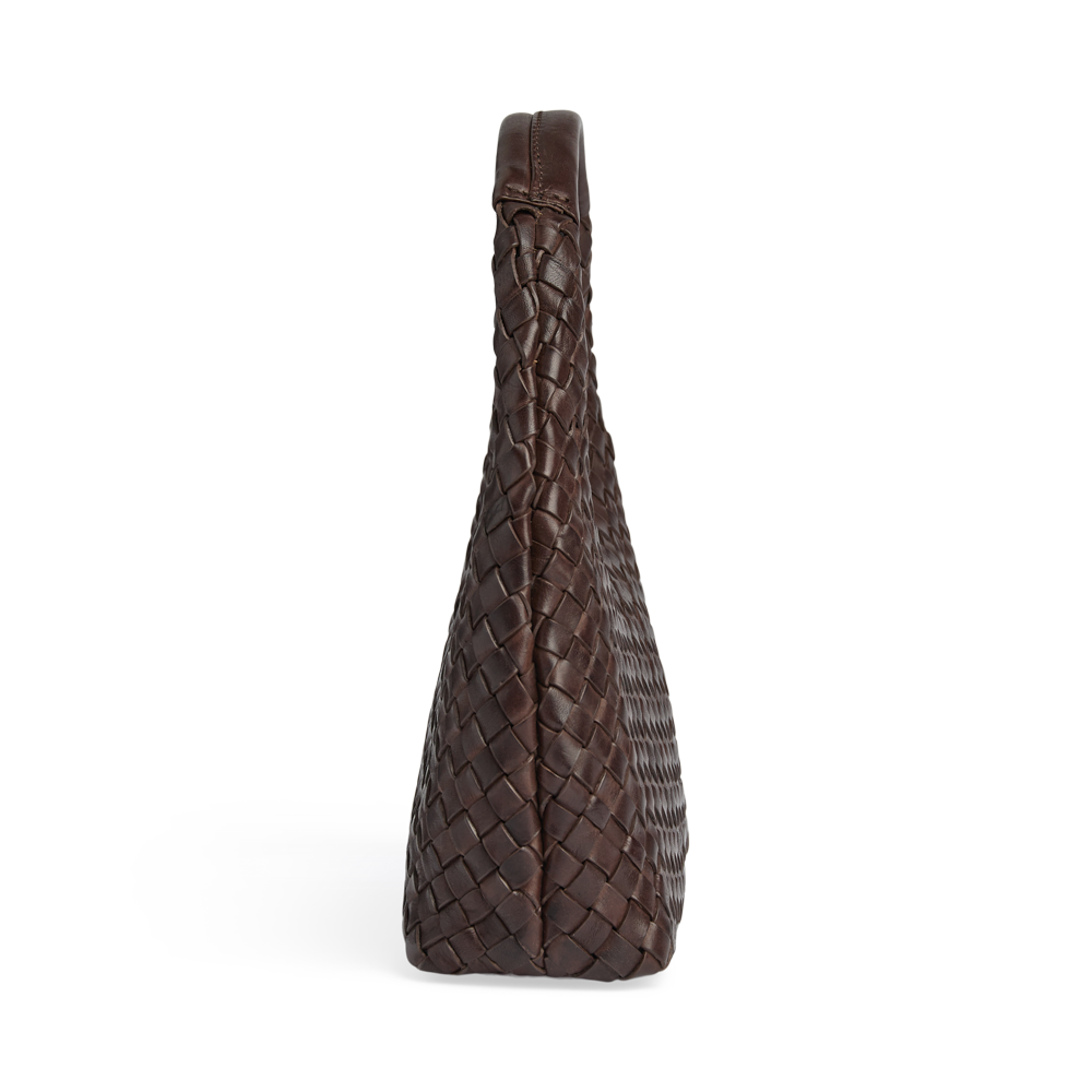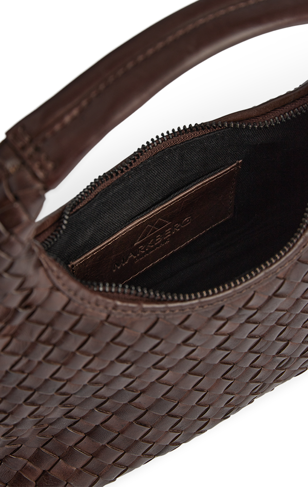 A compact handbag with hand-braided leather and an elegant silhouette.
