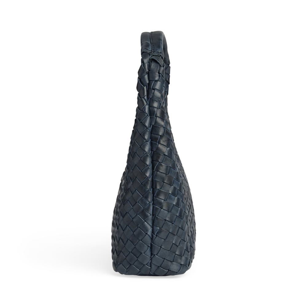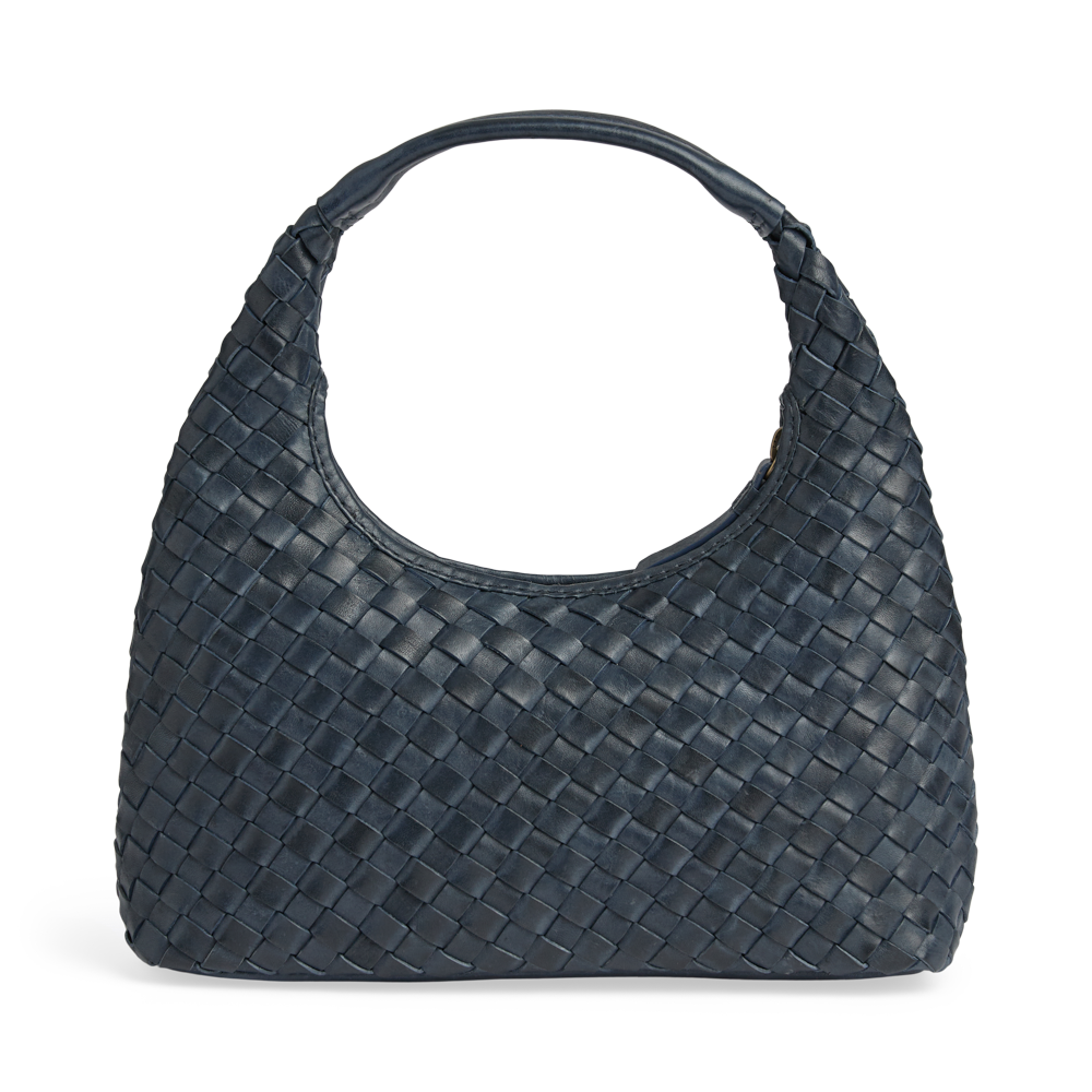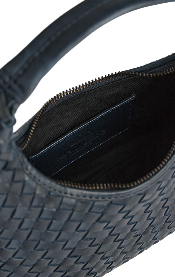 A compact handbag with hand-braided leather and an elegant silhouette.