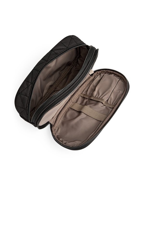 • The front zip compartment includes dividers for makeup brushes as well as two pockets