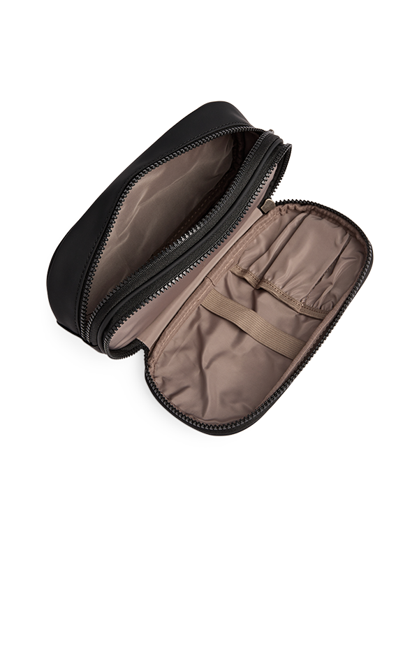 The front zip compartment includes dividers for makeup brushes as well as two pockets