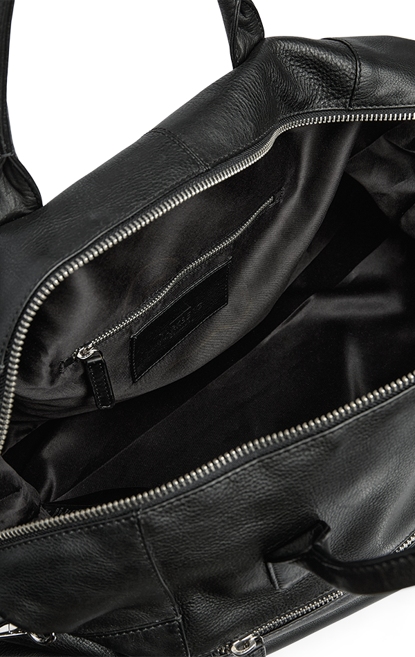 • Made from genuine calf leather • Large main compartment with interior zip pocket • Front zip pocket • Back strap for attaching to a suitcase • Detachable and adjustable shoulder strap • Two carry handles • Zip closure • Durable cotton lining inside